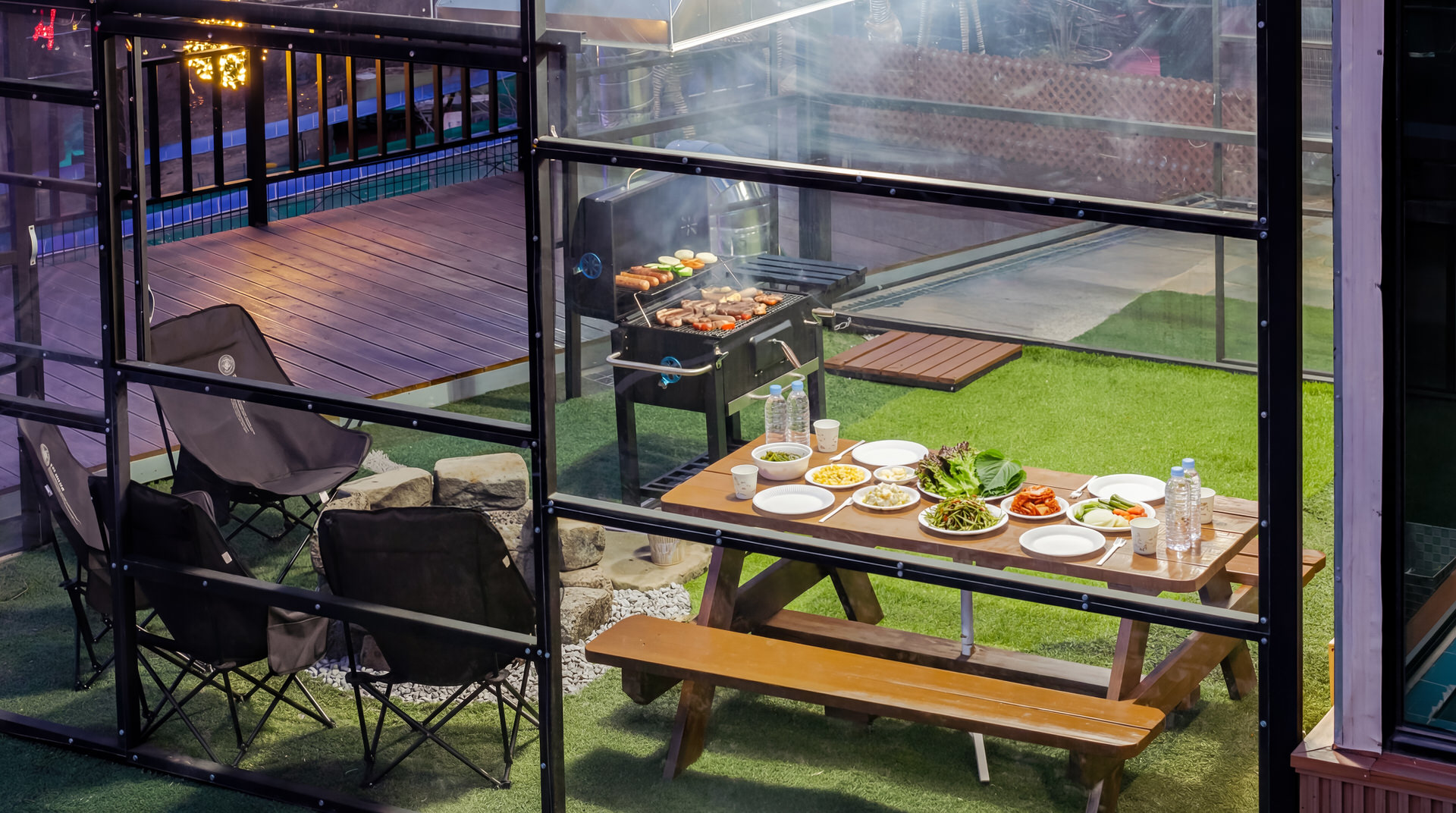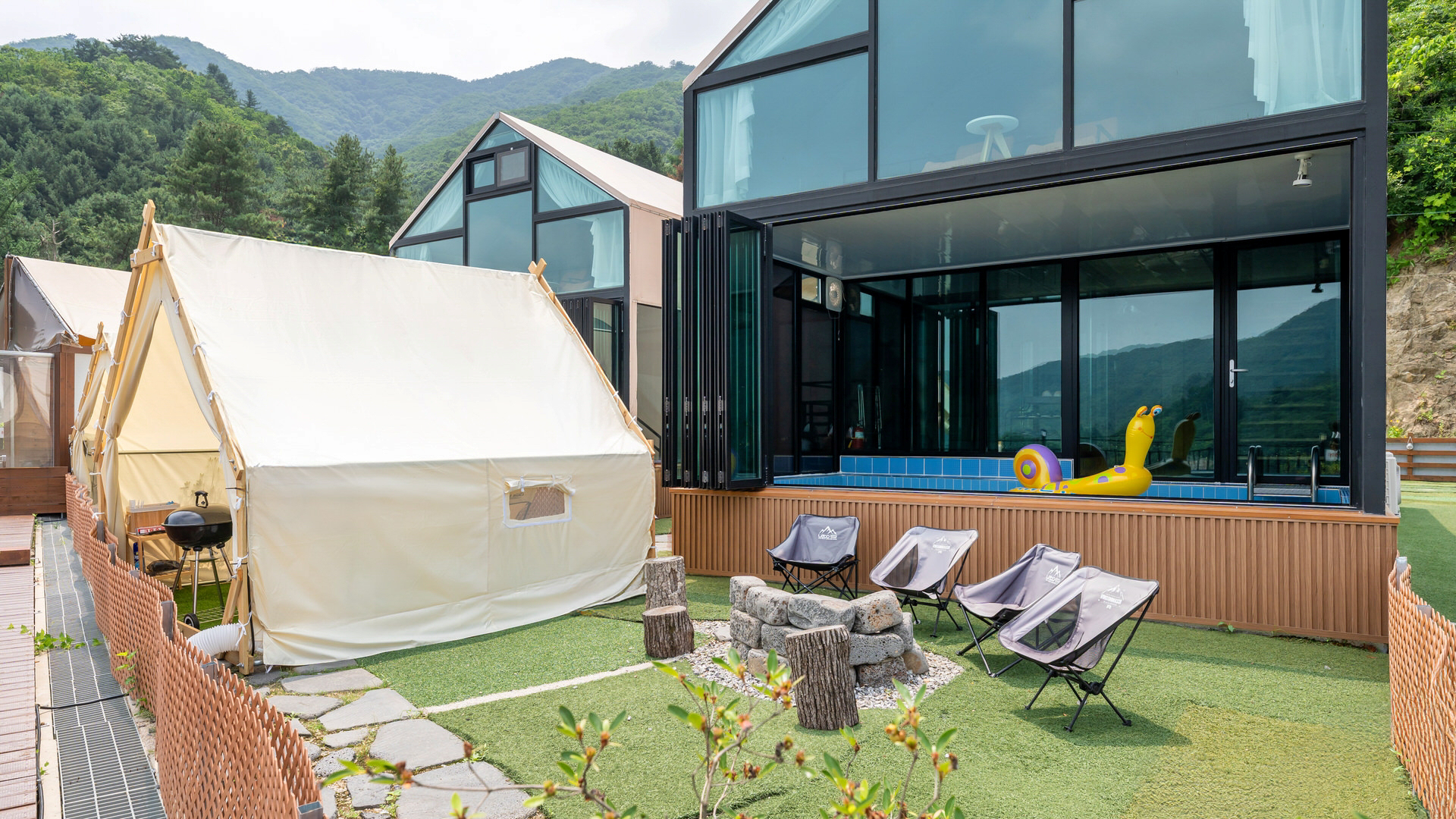 - 집기품목 : 침대방, 와이파이, 취사시설/도구, 인덕션, 냉장고, TV, 전자레인지, 커피머신, 글램핑, 풀빌라, 개별바비큐, 개별수영장, 욕실용품, OTT, 치약, 샴푸